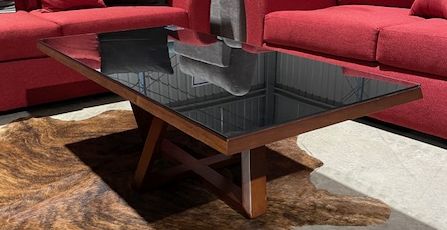 Black finish with walnut timber legs and trim Tempered Glass top