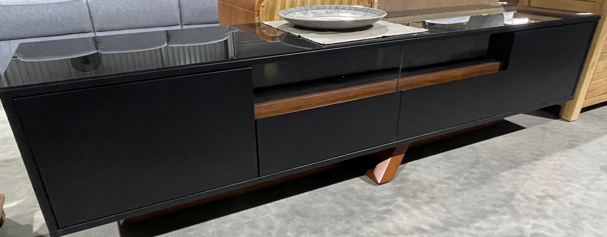 Tempered black Glass and walnut timber 1300 L x 590 W x 410 H