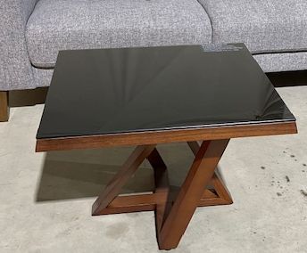Black finish with walnut timber legs and trim Tempered Glass top